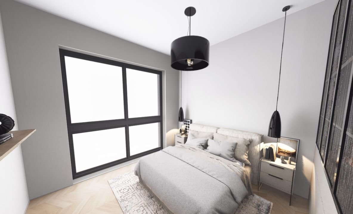 sypialnia z dużym oknem i miejscem na szafę w zabudowie