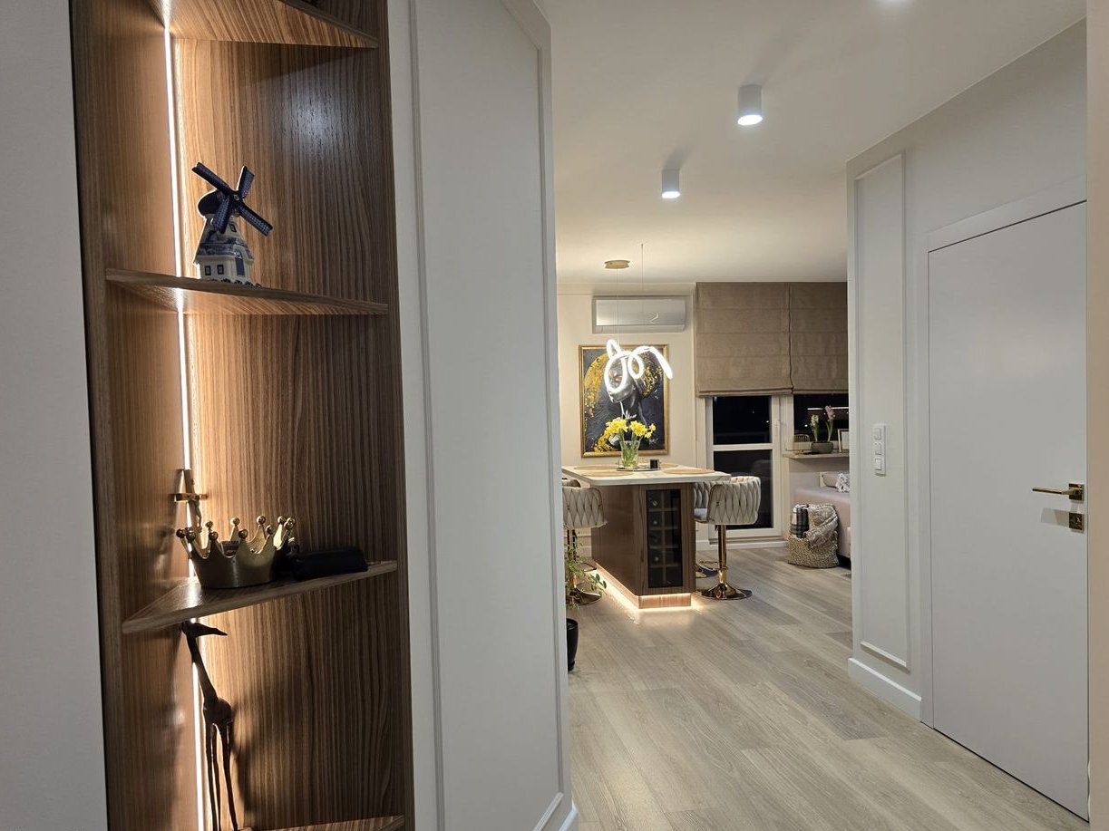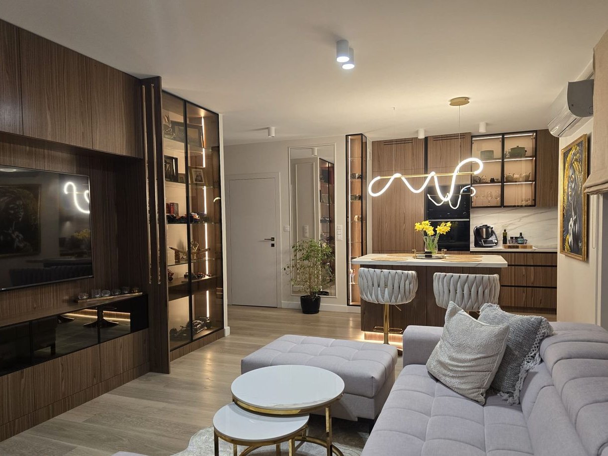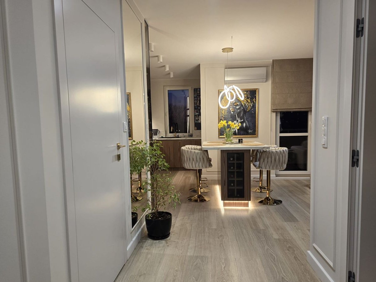 Wnętrze zostało urządzone w wysokim standardzie wykończenia, z dbałością o każdy detal; zaprojektowane przez architekta. Cała zabudowa meblowa została wykonana na wymiar przez stolarza, co zapewnia maksymalne wykorzystanie przestrzeni i spójny, elegancki charakter wnętrza. W mieszkaniu znajdują się: