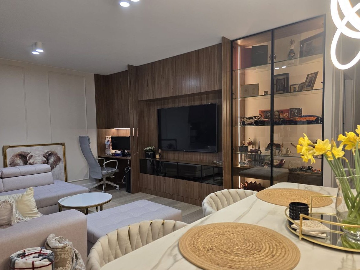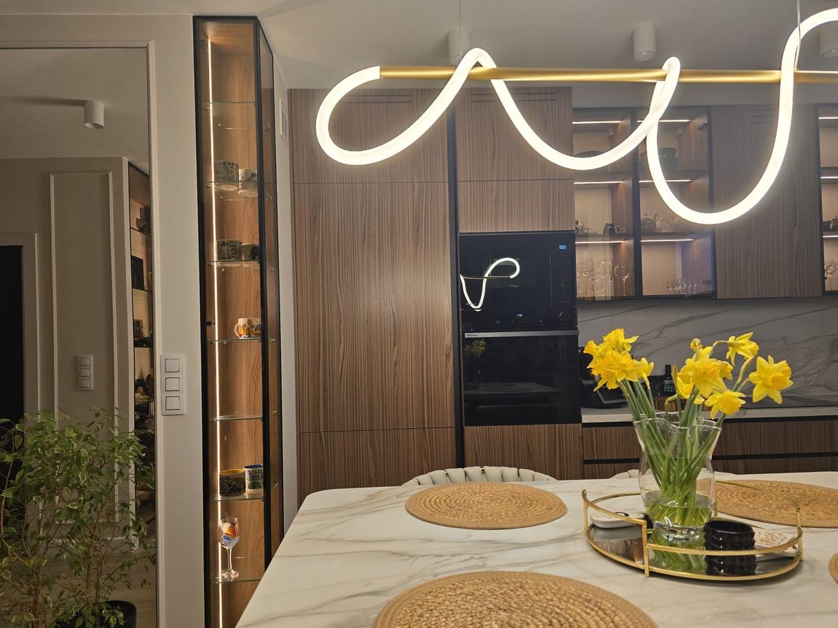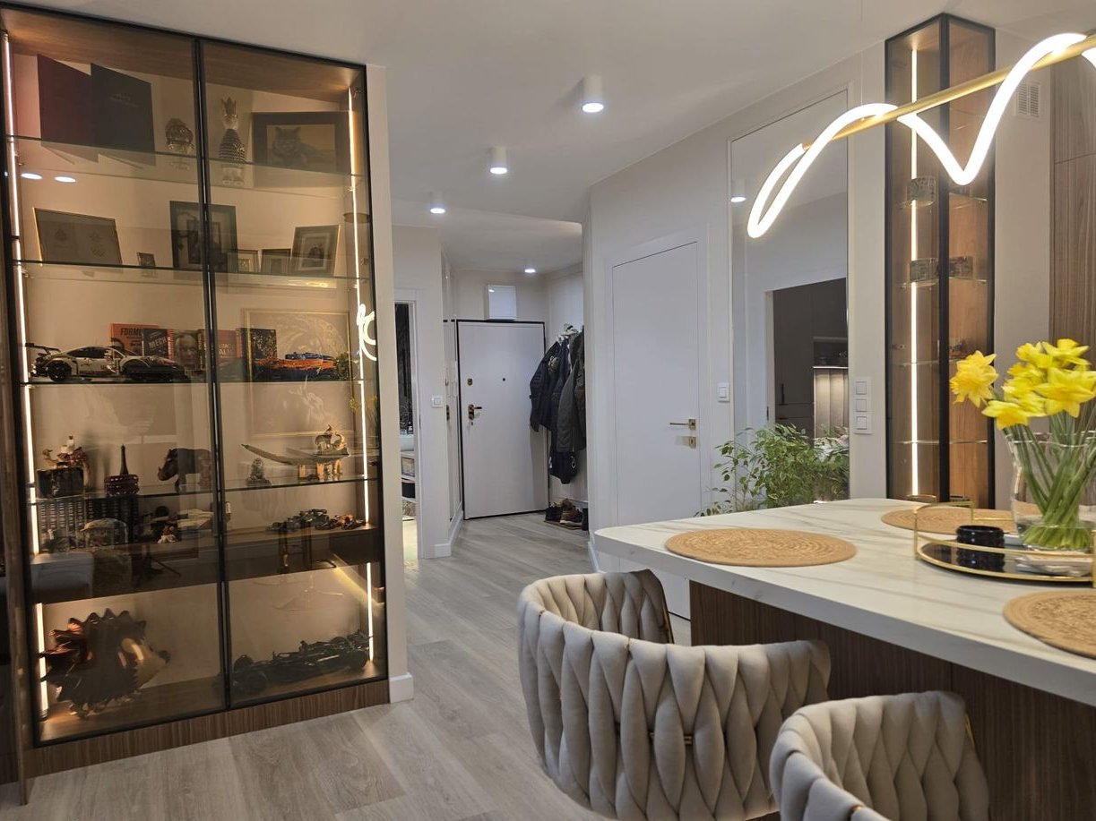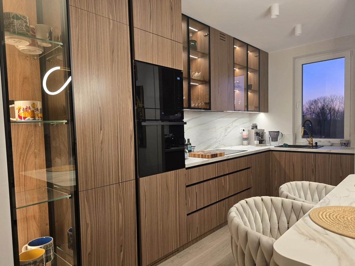 Wnętrze zostało urządzone w wysokim standardzie wykończenia, z dbałością o każdy detal; zaprojektowane przez architekta. Cała zabudowa meblowa została wykonana na wymiar przez stolarza, co zapewnia maksymalne wykorzystanie przestrzeni i spójny, elegancki charakter wnętrza. W mieszkaniu znajdują się: