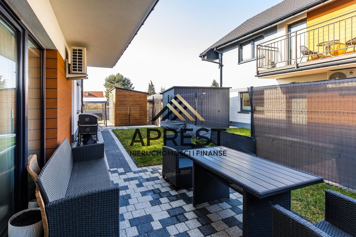 Do mieszkania przynależy ogródek o powierzchni 50 m2 oraz 3 miejsca parkingowe. Ta prywatna strefa została starannie zagospodarowana tarasem z kostki brukowej oraz trawą z rolki, a dostęp do niej zapewniają dwa niezależne wyjścia. Całe osiedle charakteryzuje się estetycznym wykończeniem z kostki brukowej. Komfort mieszkańców podnosi zainstalowane w całym lokalu ogrzewanie podłogowe zasilane dwufunkcyjnym kotłem gazowym oraz system klimatyzacji. Wnętrza wyposażono w energooszczędne okna 3-szybowe z roletami dzień-noc, a o jakość wody dba nowoczesny zmiękczacz z filtrami. W lokalu znajduje się również instalacja siłowa oraz szybki światłowód.