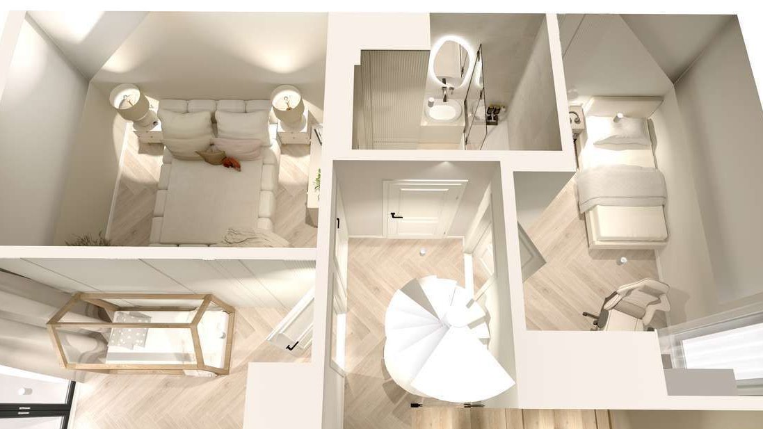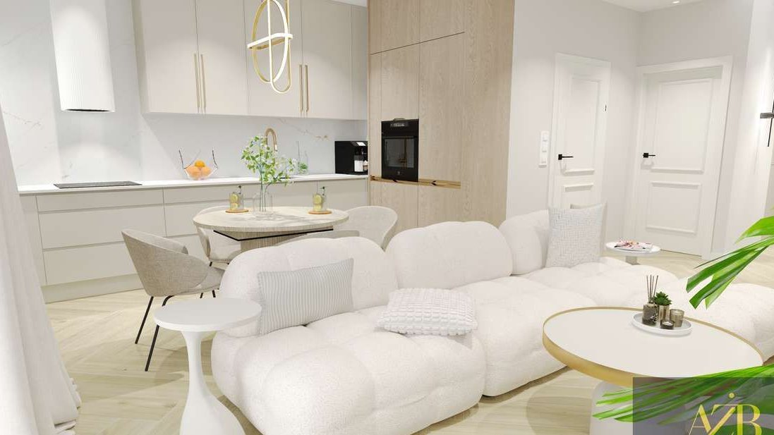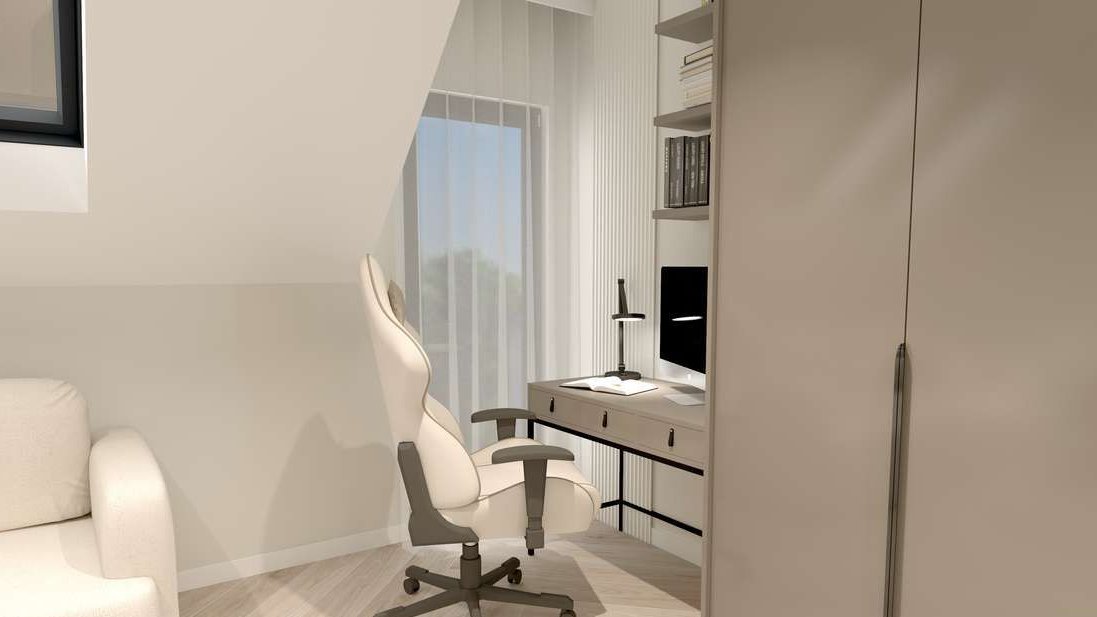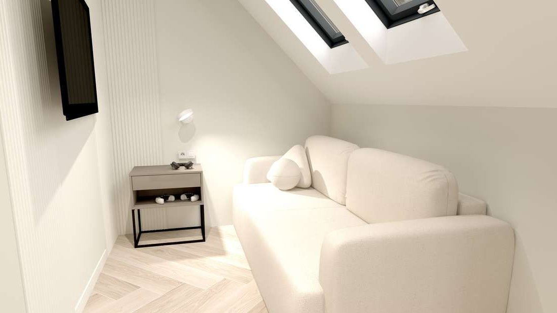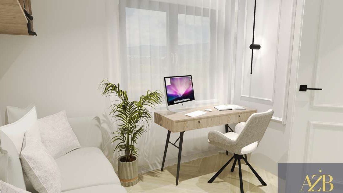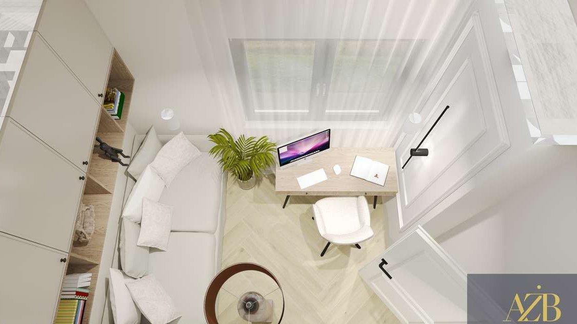 Został wykonany projekt aranżacyjny oraz wykonawczy całego mieszkania. Dodatkowo został przygotowane podasze płytą gipsową, głodźą i pomalowany. Oczywiście można dodatkowo wykorzystać jak sypialnia, biuro, dla dzieci, hoppy, kinowy salon. Tym samym powstał dodatkowy pokój, gratis.