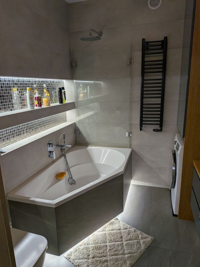 łazienka z wanną, prysznicem i dwiema umywalkami oraz WC - 5,5 m²