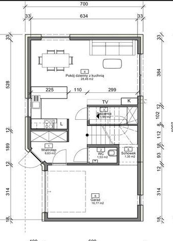 Na parterze znajduje się przestronny salon z kominkiem, jadalnią i otwartą kuchnią, spiżarnia, łazienka, wiatrołap, garaż oraz schowek. Całość doświetlona wysokiej klasy panoramicznymi oknami, obficie doświetlające wnętrze naturalnym światłem i tworzące jasną i komfortową przestrzeń.