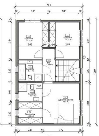 Na pierwszym piętrze możliwa jest dowolna aranżacja – nasza propozycja to master bedroom z garderobą oraz prywatną łazienką i dodatkowo dwa ustawne pokoje plus przestronna łazienka.
