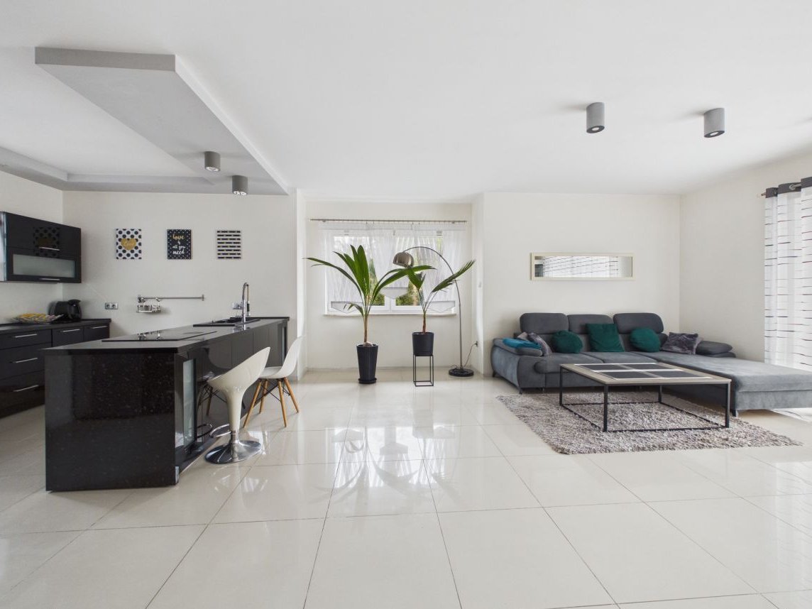 przestronny salon połączony z nowoczesną kuchnią