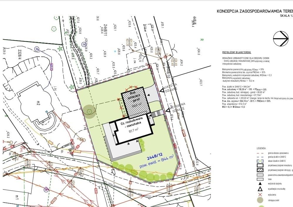 Na sprzedaż nieruchomość obejmująca działkę budowlaną o powierzchni 844 m² wraz z dokumentacją projektową oraz pozwoleniem na budowę nowoczesnego domu jednorodzinnego.