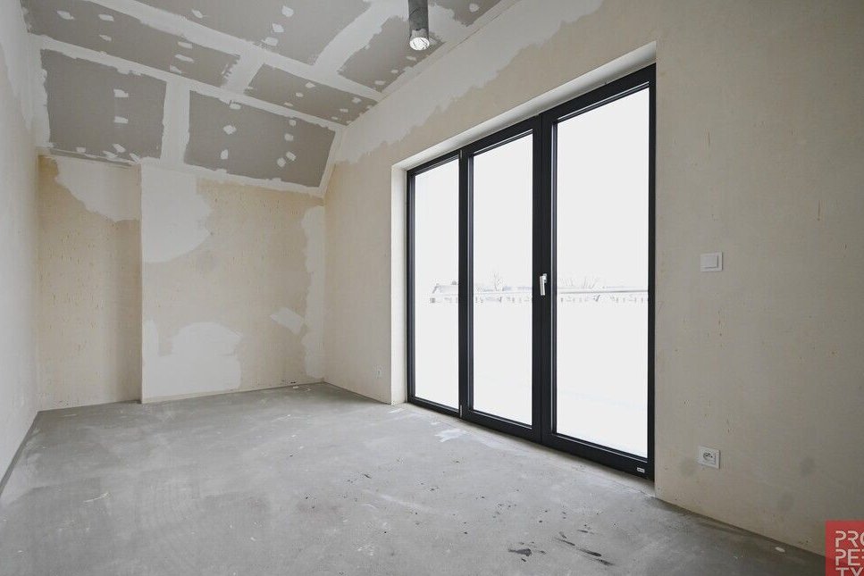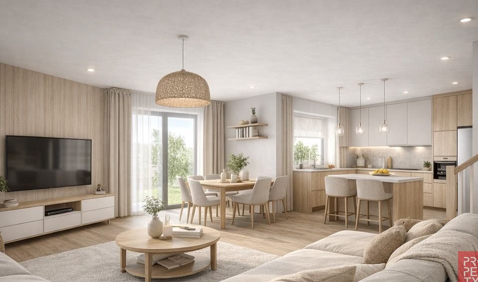 ✔ przestronny salon z wyjściem na taras (duże przesuwane drzwi), połączony z aneksem kuchennym i jadalnią. Otwarta jasna przestrzeń dzięki dużym przeszkleniom,