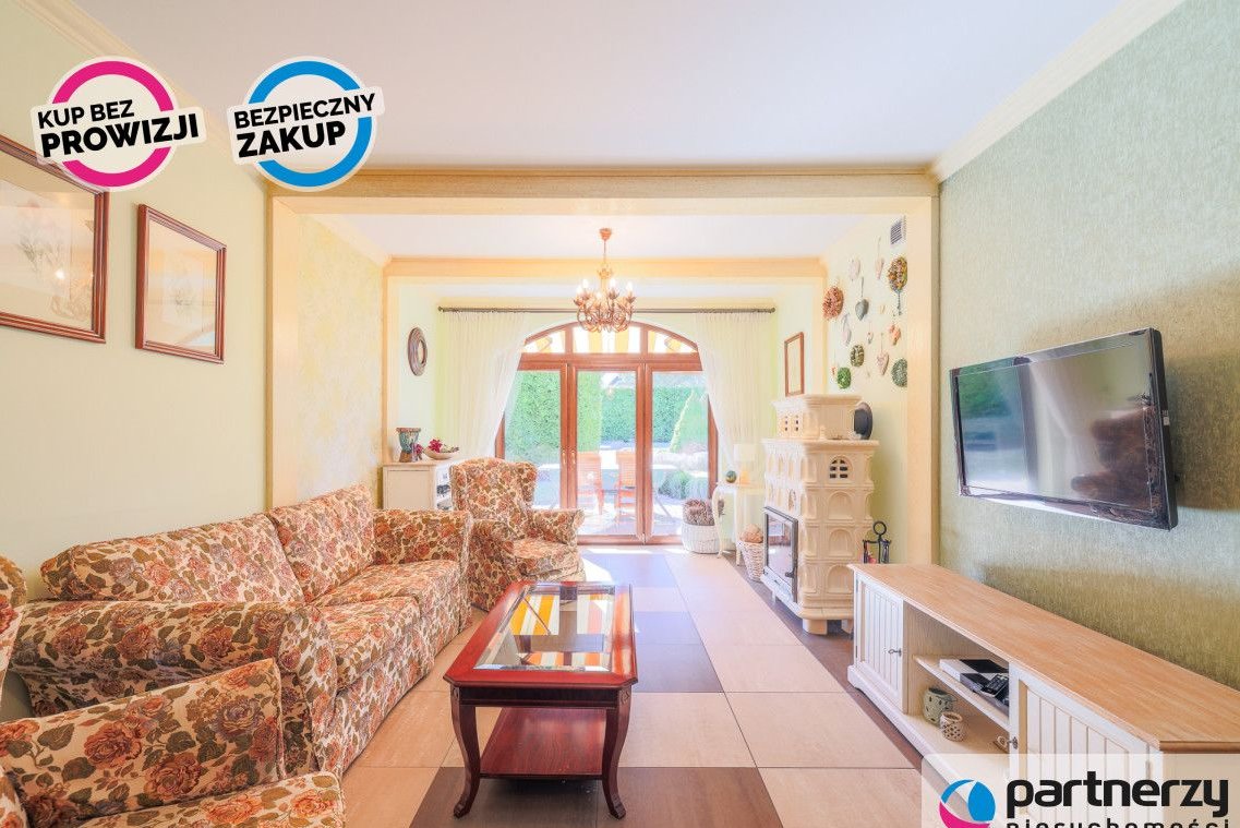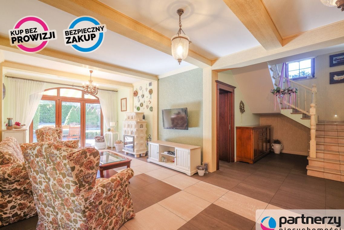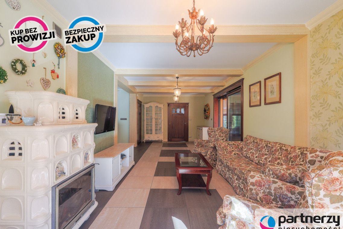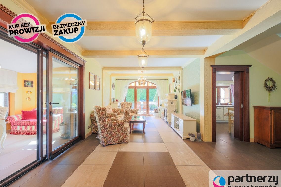 Strefa dzienna: Przestronny salon z kominkiem, nowoczesna kuchnia oraz całoroczny ogród zimowy (16 m²) pełniący funkcję jadalni.