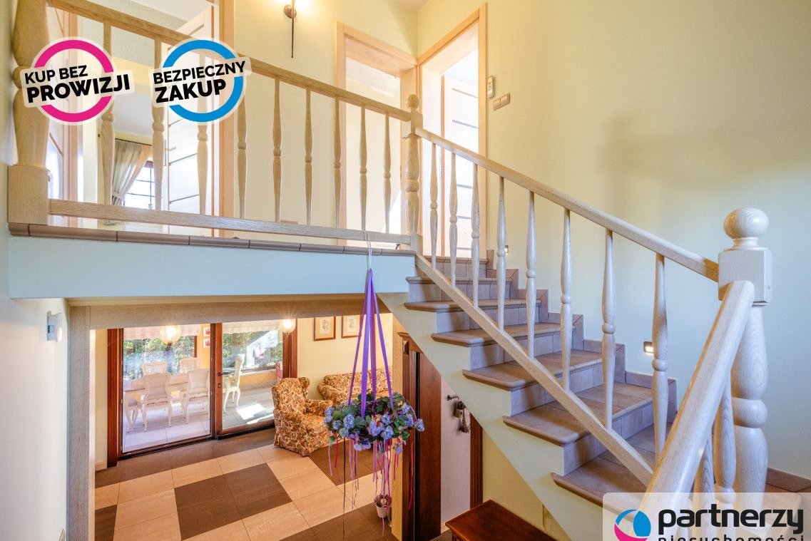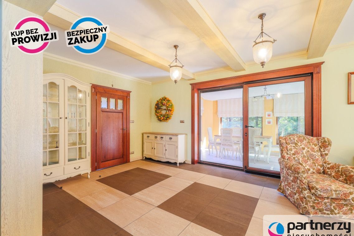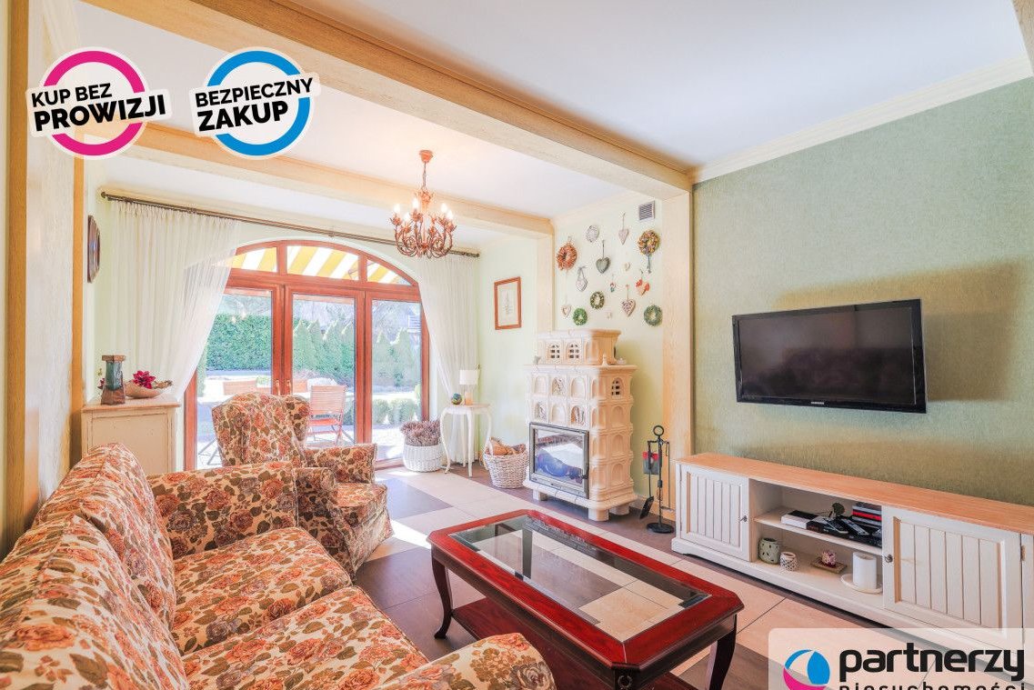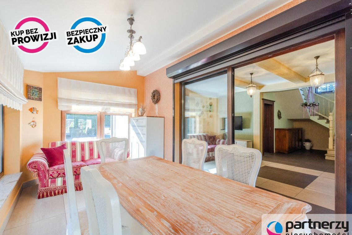 Strefa dzienna: Przestronny salon z kominkiem, nowoczesna kuchnia oraz całoroczny ogród zimowy (16 m²) pełniący funkcję jadalni.