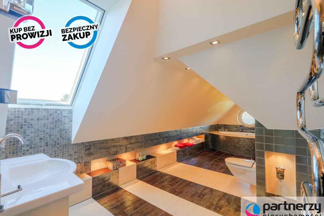 Relaks: Łazienka z widokiem na jezioro (wanna + prysznic), zintegrowany z bryłą domu grill zewnętrzny.