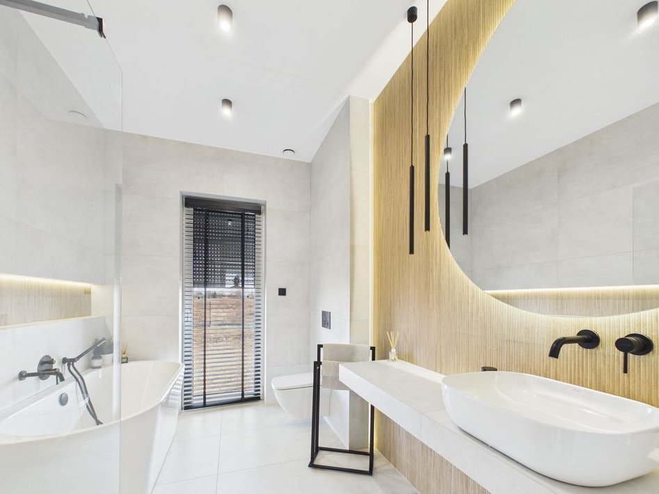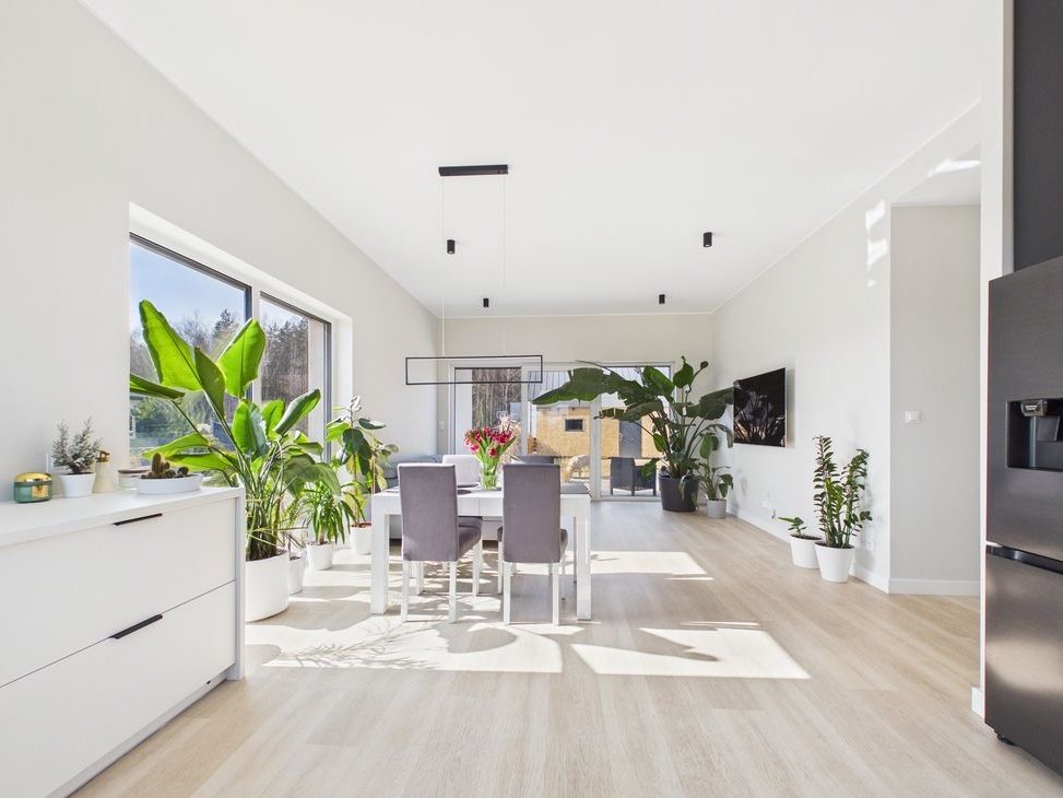 - na podłogach w kuchni, salonie oraz pokojach jakościowy vinyl, w łazienkach, wiatrołapie i kotłowni kafle