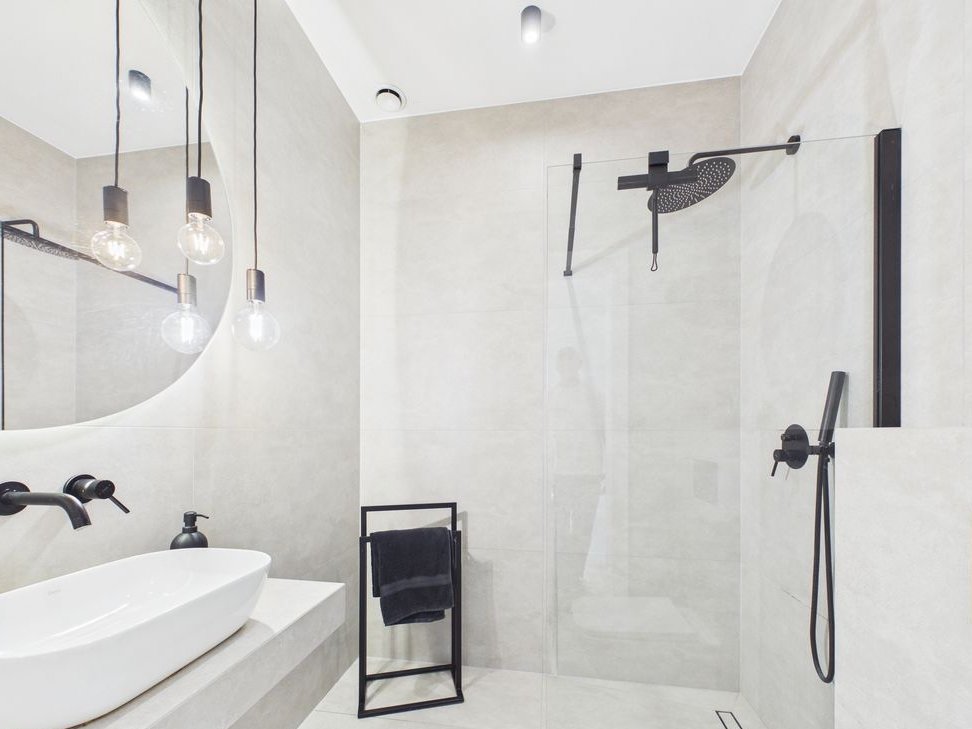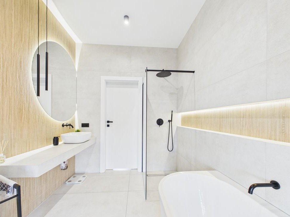 - duża łazienka z wanną i kabiną prysznicową oraz drzwiami balkonowymi