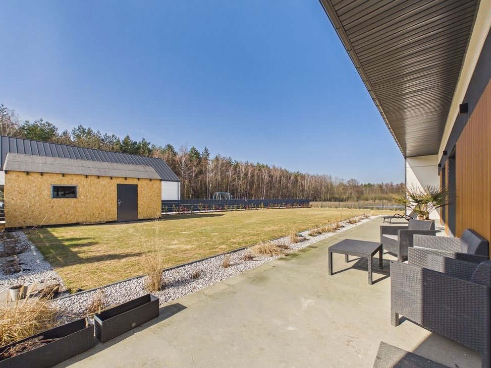 - salon od strony południowo-zachodniej z wyjściem na częściowo zadaszony, ponad 50-metrowy taras wykonany z wylewki betonowej, z którego wychodzimy na bajeczny ogród, który częściowo został zagospodarowany trawnikiem z systemem nawadniania, a wzdłuż ogrodzenia zostały posadzone krzewy ozdobne Z kolei korytarzem w prawo przechodzimy do części nocnej, gdzie znajdują się: