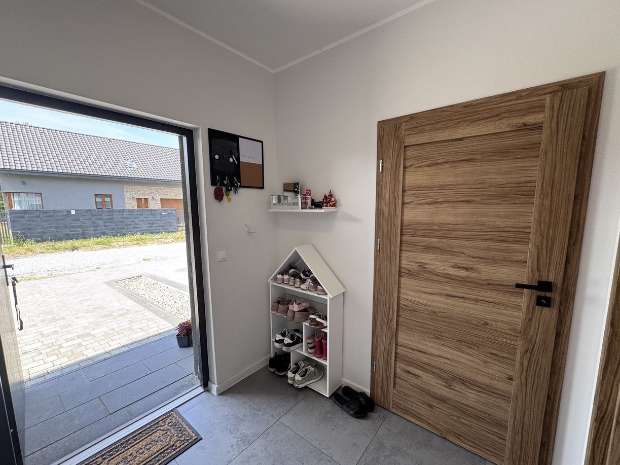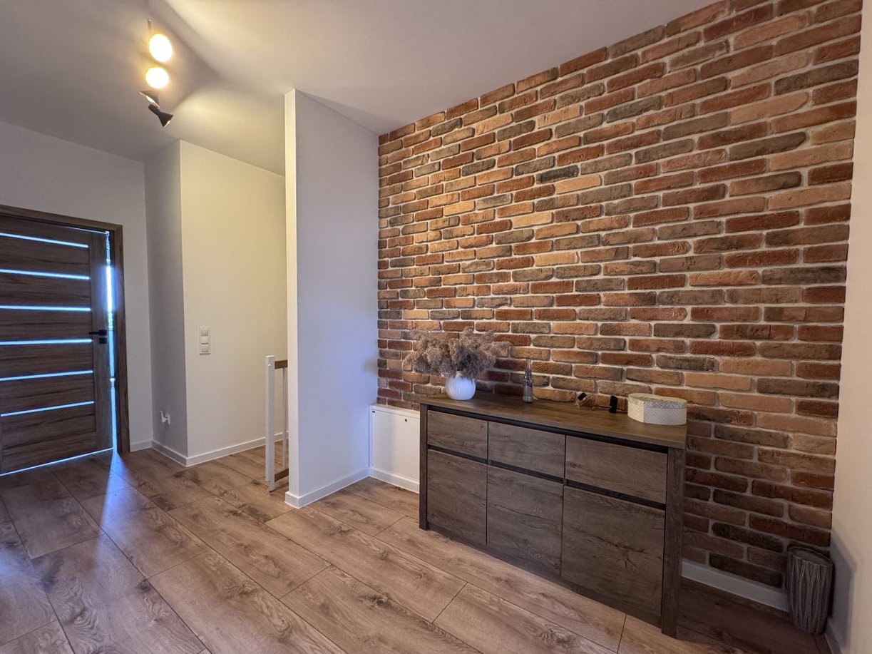 W domu znajduje się 5 funkcjonalnych pokoi, w tym przytulny salon z dekoracyjną ścianą z cegły i narożnym kominkiem, z wyjściem na taras i ogród. Otwarta kuchnia z jadalnią wyposażona jest w pełne AGD i nowoczesną zabudowę. Sypialnia główna z francuskim balkonem, pokój dziecięcy/gabinet, stylowa łazienka z wanną i prysznicem walk-in oraz przestronny hol z wiatrołapem tworzą wygodną i estetyczną przestrzeń do życia. Wnętrza wykończone w spójnym stylu, z dbałością o detale.