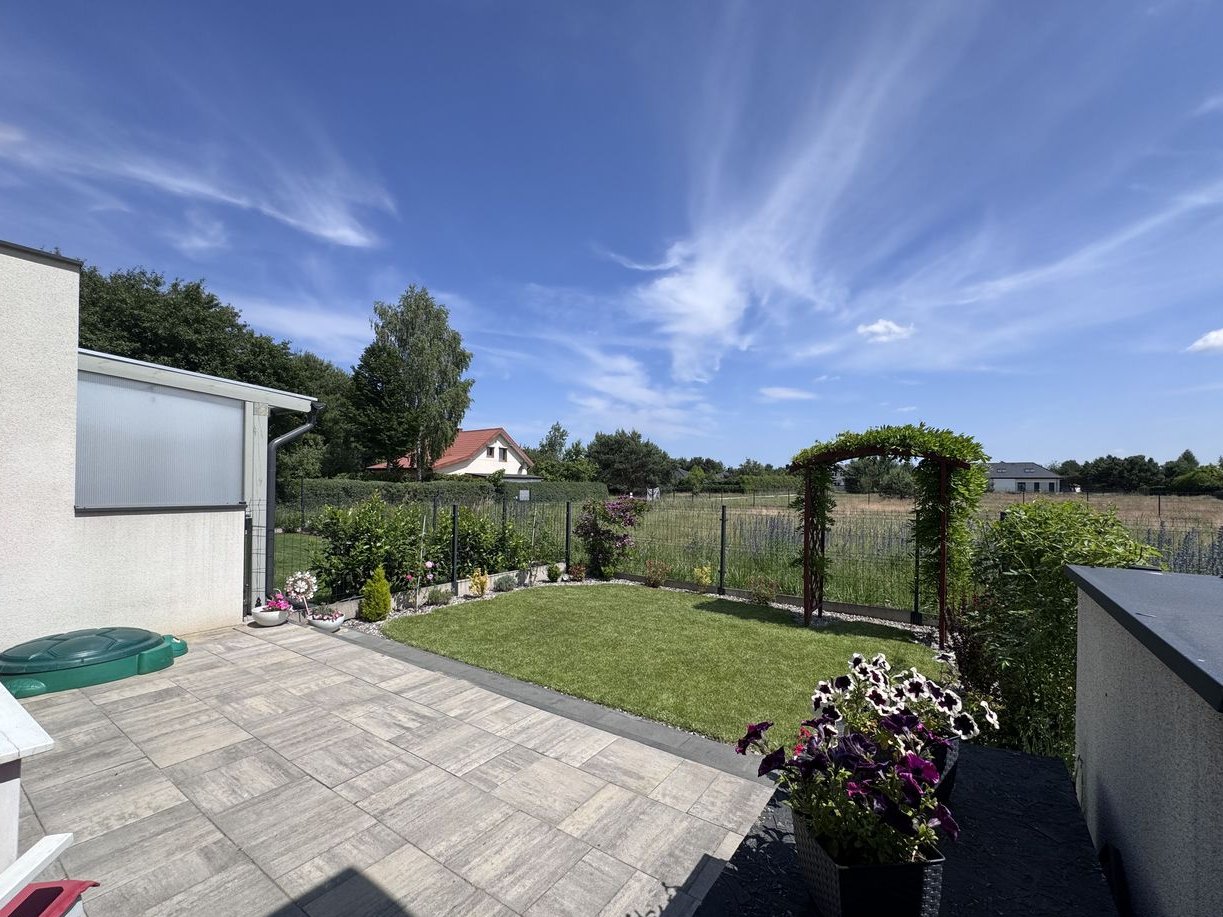 Ogrzewanie centralne, dodatkowo kominek. Kameralny ogród z tarasem i widokiem na otwartą przestrzeń zapewnia prywatność i relaks.