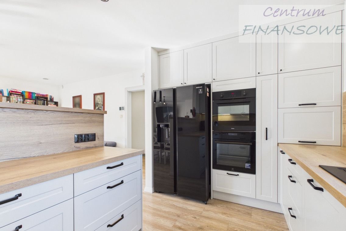 • kuchnia wykonana na zamówienie wyposażona jest w nowoczesne systemy BLUM oraz sprzęt renomowanych producentów (lodówka Samsung, zmywarka Bosh, piekarnik Elektrolux, piekarnik Amica, indukcja Elektrolux)