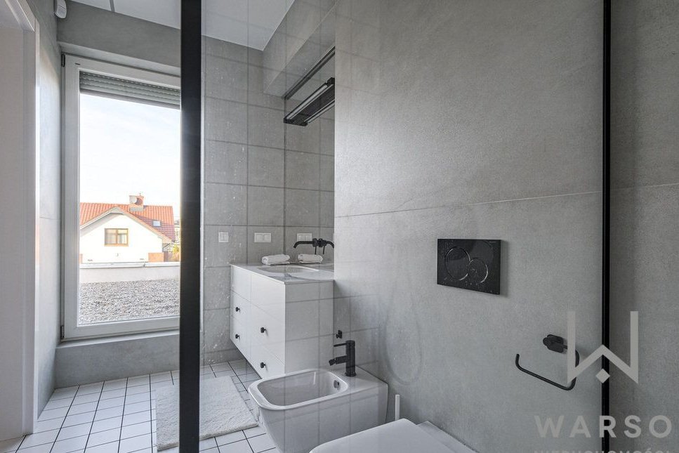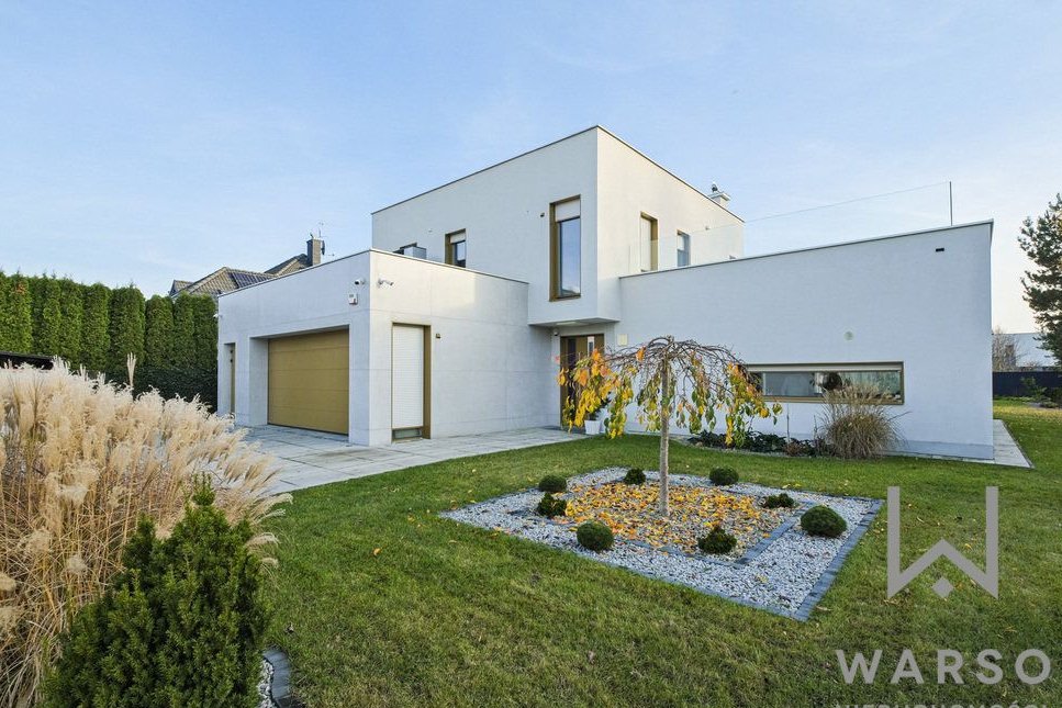 W bryle budynku mieści się garaż na dwa auta oraz pomieszczenie techniczne z serwerownią. Z tyłu domu rozciąga się zadbany ogród oraz przestronny taras.