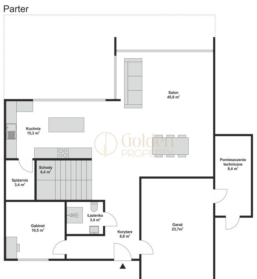 - ogromna, otwarta strefa dzienna na parterze (blisko 70 m²),