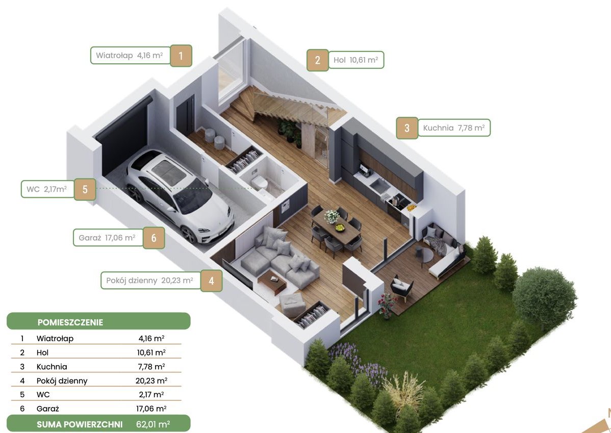 strefę dzienną na parterze – przestronny, dobrze doświetlony salon z wyjściem na ogród, otwarta kuchnia z jadalnią, WC, garaż i zaplecze gospodarcze,