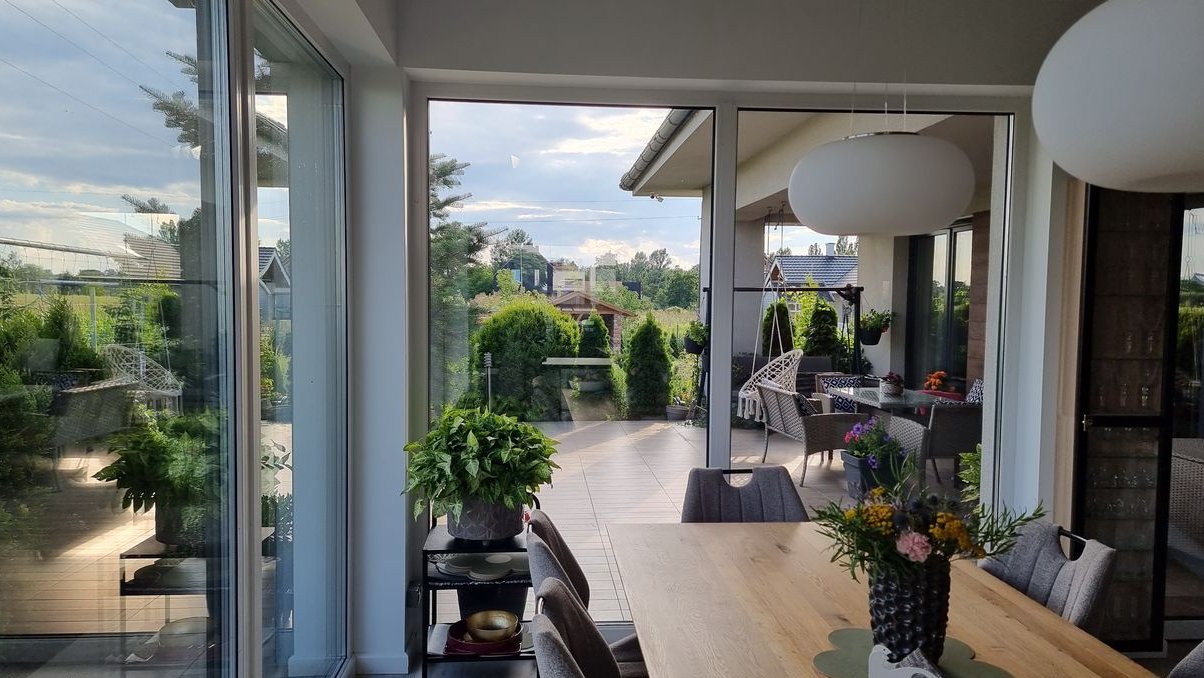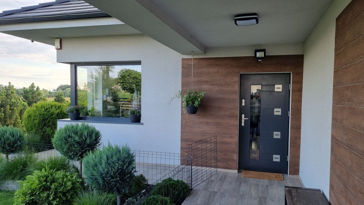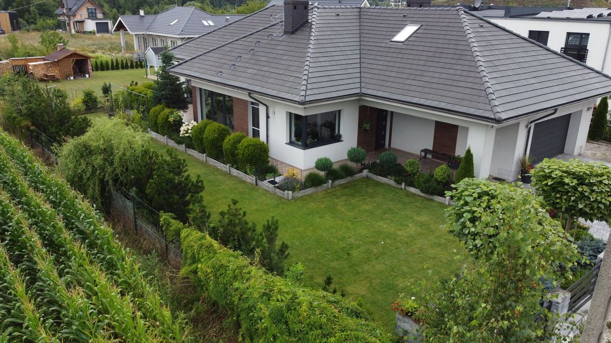 Dom wolnostojący, parterowy, z zaadaptowanym poddaszem, niepodpiwniczony o powierzchni 275 m2 (po tzw. podłodze 370 m2), wybudowany metodą tradycyjną w 2019 roku, posadowiony na działce o powierzchni 848 m2. W bryle budynku garaż dwustanowiskowy, przed budynkiem miejsca postojowe. Działka w kształcie prostokąta, zagospodarowany ogród z automatycznym podlewaniem, teren przed domem wyłożony kostką.
