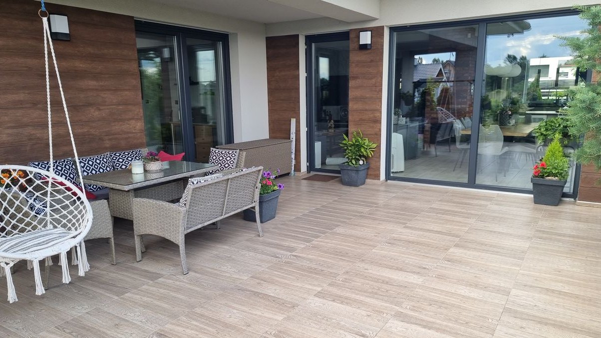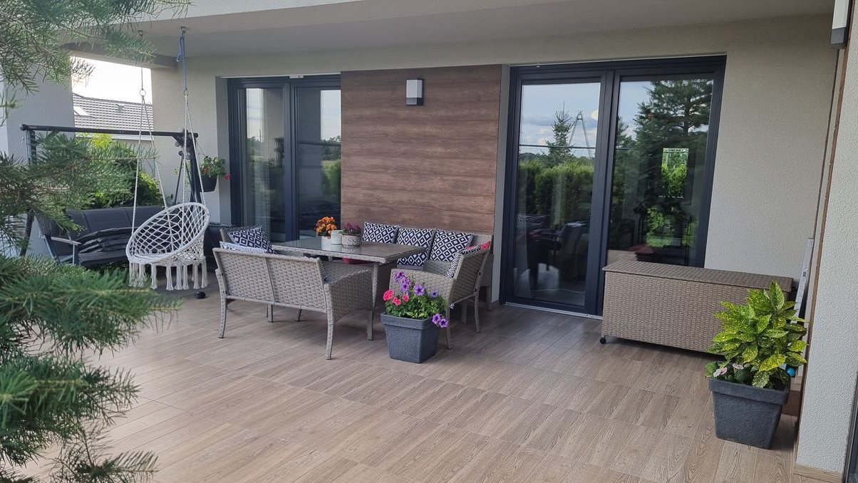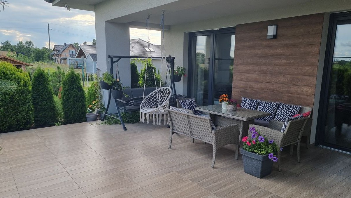 taras ok. 40 m2 wyłożony płytkami, częściowo zadaszony