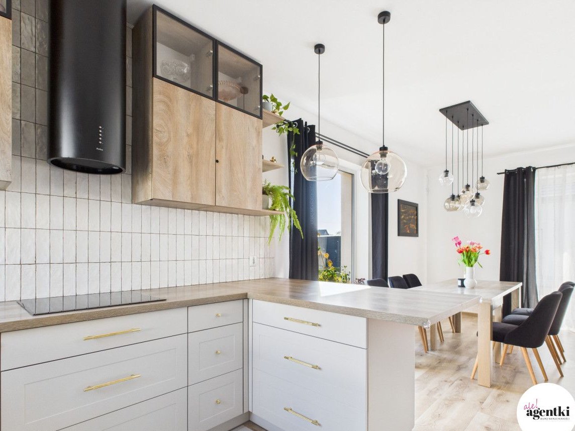 - Otwarta kuchnia z oknem, wykonana na zamówienie przez stolarza - wysokiej jakości zabudowa, duża wyspa,