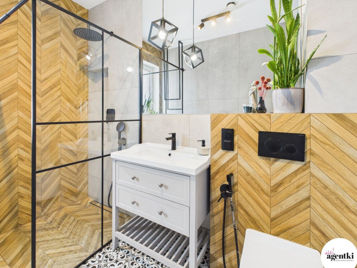- Łazienka z oknem i prysznicem, wykończona w nowoczesnym stylu,