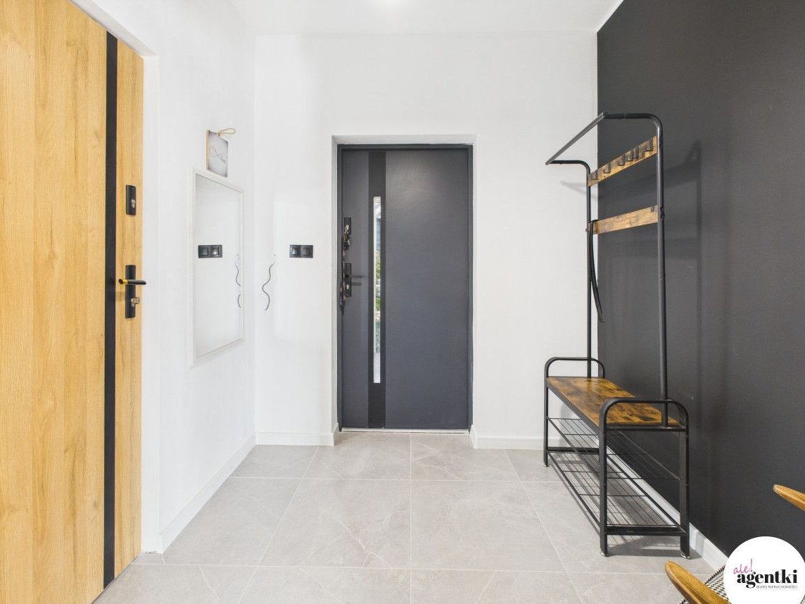 - Przestronny salon z dużymi oknami o południowej ekspozycji, gwarantujący mnóstwo naturalnego światła oraz piękny widok na zieleń,