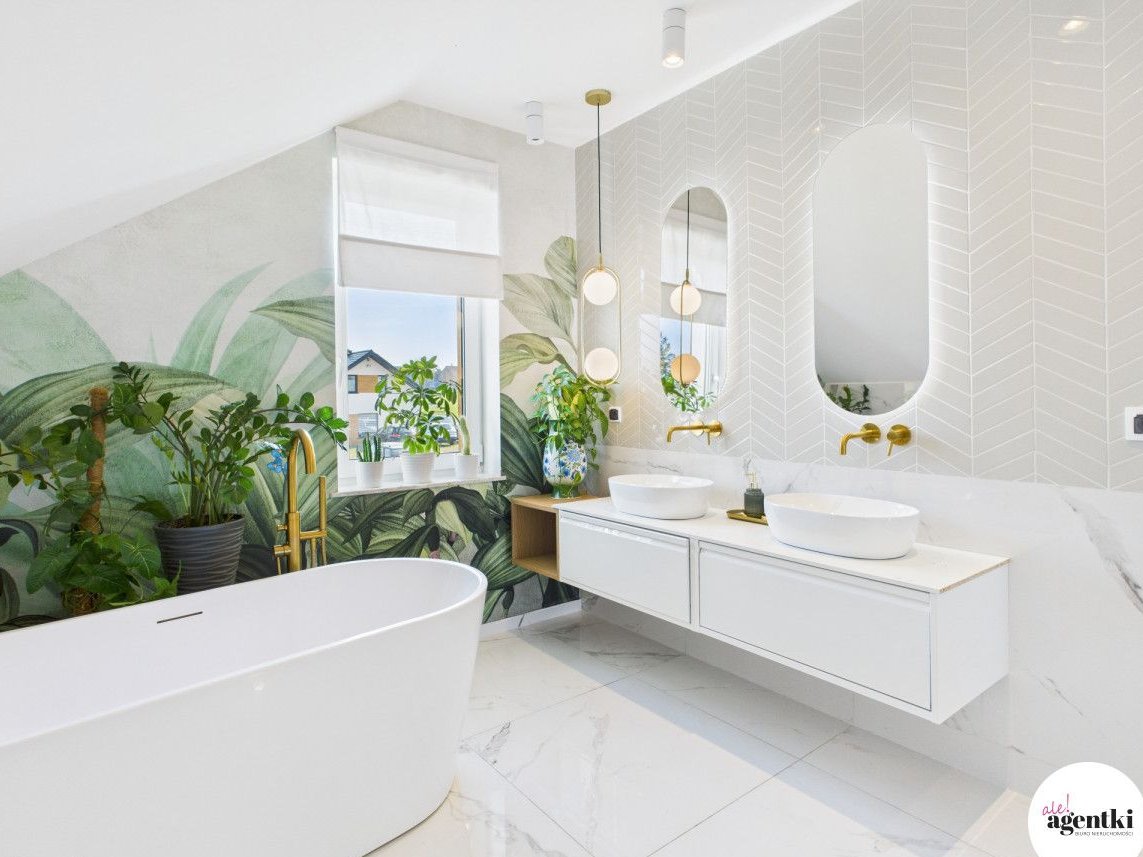 - Łazienka z wolnostojącą wanną i dwiema umywalkami, doświetlona standardowym oknem,