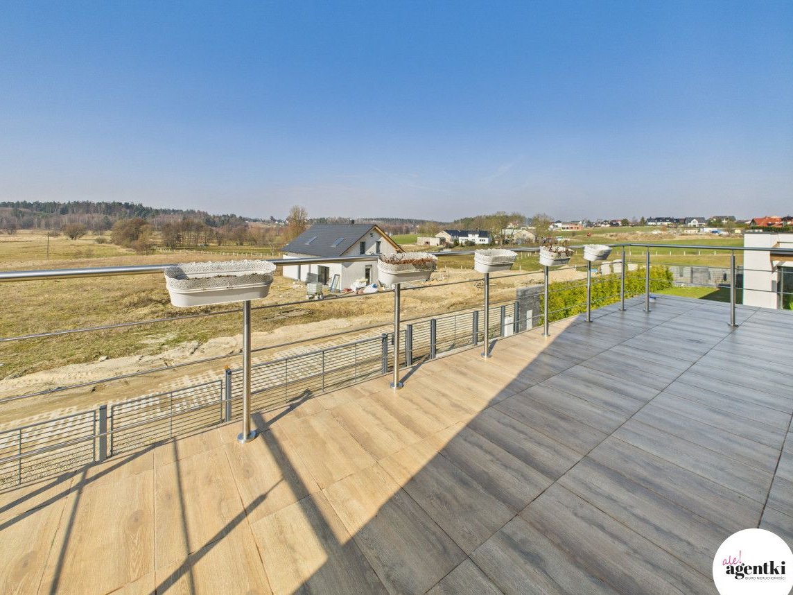 Działka jest płaska z lekkim wzniesieniem, oferując dużą przestrzeń do zagospodarowania. Przy domu znajduje się duży taras, idealny do relaksu na świeżym powietrzu. Okolica jest cicha i zielona - w pobliżu łąki, lasy oraz ścieżki spacerowe i rowerowe.