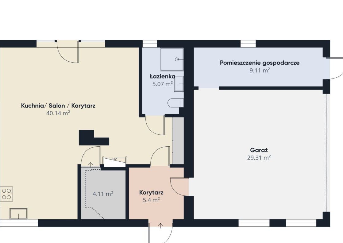 - Wiatrołap z dostępem do garażu dwustanowiskowego oraz pomieszczenia gospodarczego.