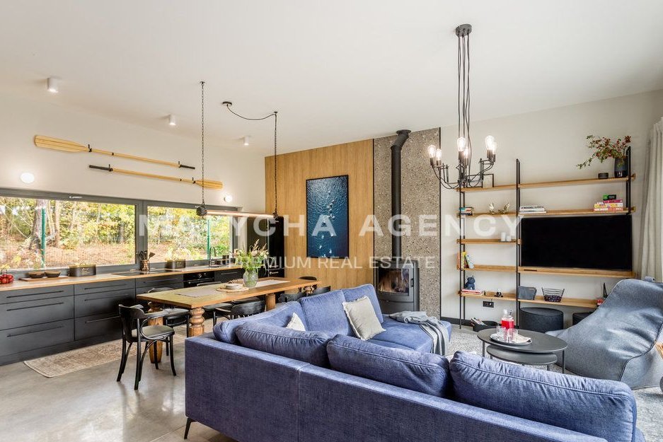 Dom w Bartoszach to komfortowa, nowocześnie zaprojektowana i urządzona przestrzeń, która harmonijnie łączy się z otoczeniem. Wnętrze domu jest pełne naturalnego światła. Przytulną atmosferę buduje umiejętnie dobrane wyposażenie, które zostało wycenione i może być przedmiotem sprzedaży.