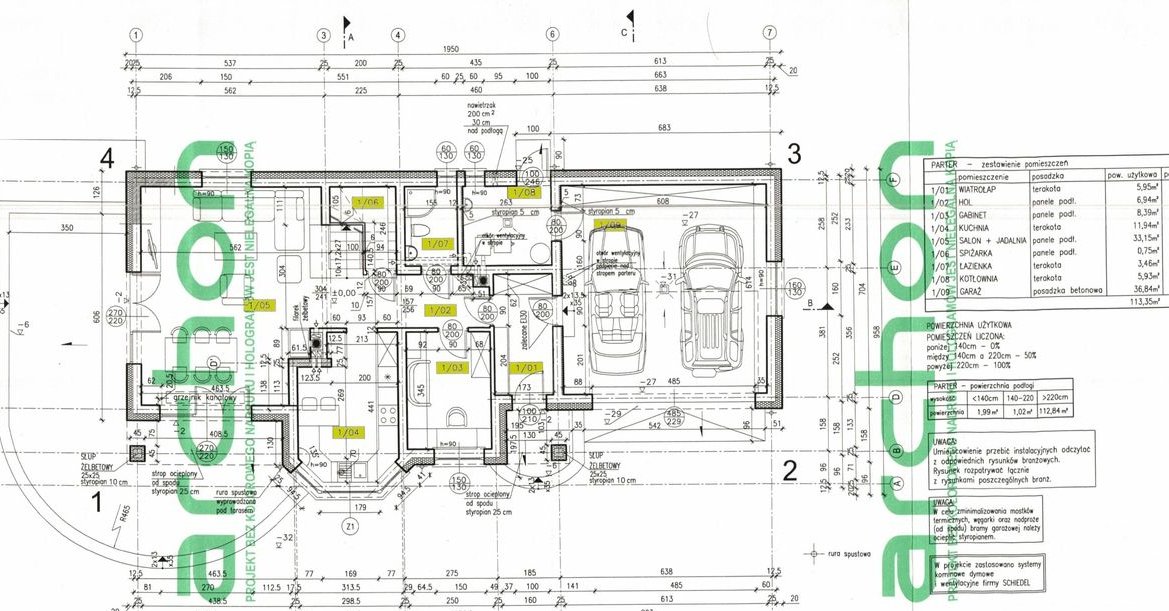 Parter ( 113,35 m2): salon z jadalnią, kuchnia, spiżarka, łazienka, gabinet, kotłownia, hol, wiatrołap, garaż na 2 samochody