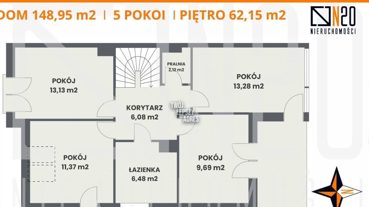 Na piętrze (62 m2) znajdują się: cztery jasne sypialnie, łazienka z oknem oraz pralnia. .