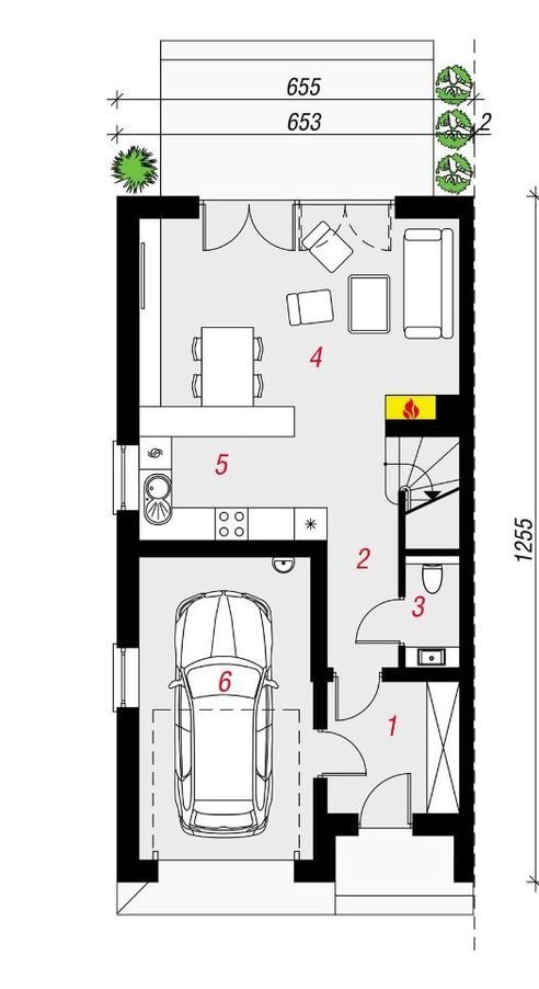 PARTER: to dobrze doświetlona naturalnym światłem strefa dzienna z otwartym na taras salonem, który płynnie łączy się z jadalnią oraz funkcjonalna kuchnia. Taras stanowi atrakcyjne przedłużenie strefy dziennej domu. W pobliżu schodów zlokalizowano toaletę, a z wiatrołapu mieszkańcy mają dostęp do jednostanowiskowego garażu.