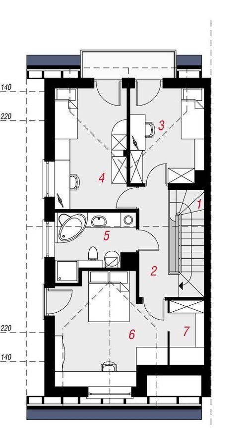 PODDASZE: to starannie zorganizowana, funkcjonalna strefa nocna domu. Zaprojektowano tutaj wygodną sypialnię rodziców z miejscem na biurko i obszerną garderobą, dwa ustawne pokoje doświetlone drzwiami balkonowymi, jasną łazienkę z wanną i prysznicem.