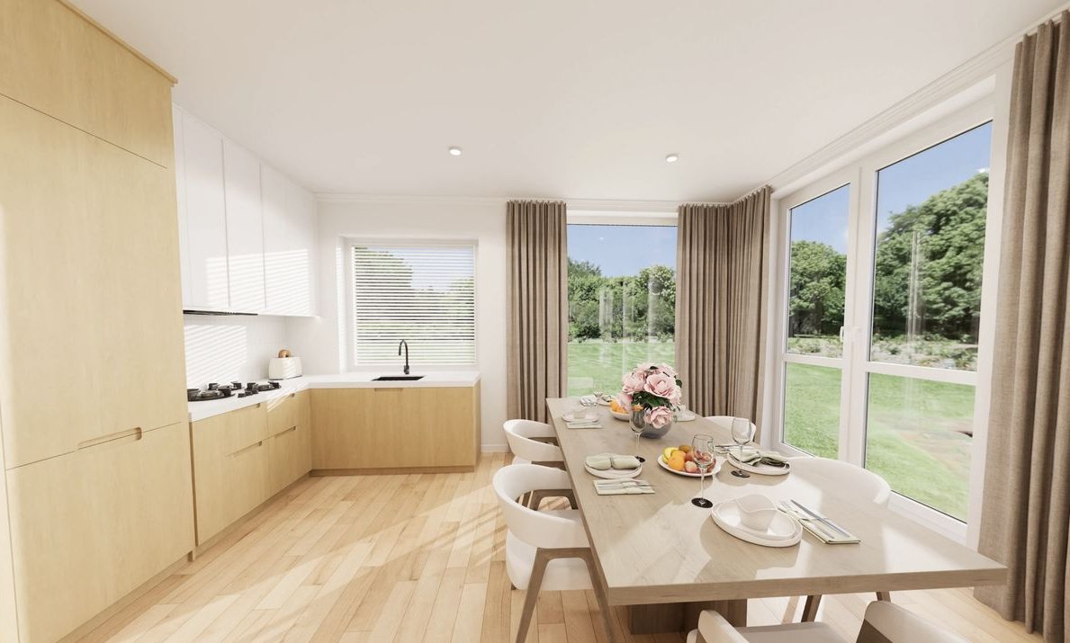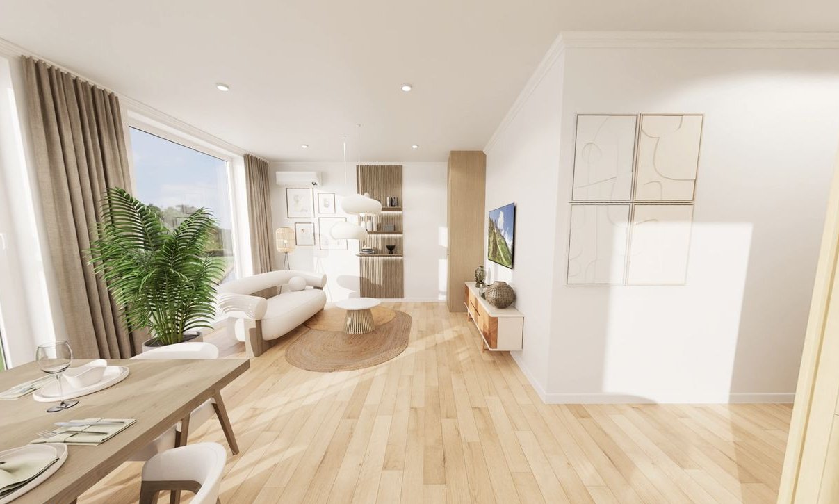 jasny, przestronny salon z aneksem kuchennym i miejscem na jadalnię,