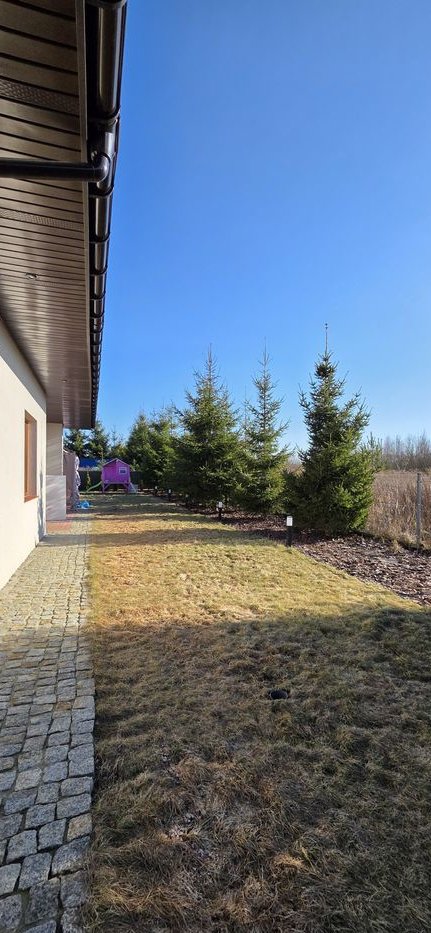Teren w pełni zagospodarowany, wyposażony w system automatycznego nawadniania, nasadzenia drzew, posiana trawa, tarasy wyłożony kostką brukową, podjazdy oraz opaski budynków z kostki granitowej, dodatkowy garaż.