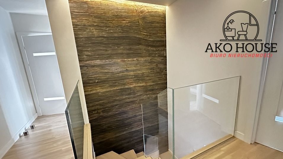 Centralnym punktem aranżacji jest kamienna, podświetlana ściana na klatce schodowej, która w połączeniu ze szklanymi poręczami tworzy efektowną, nowoczesną kompozycję, potęgując wrażenie przestrzeni i lekkości.