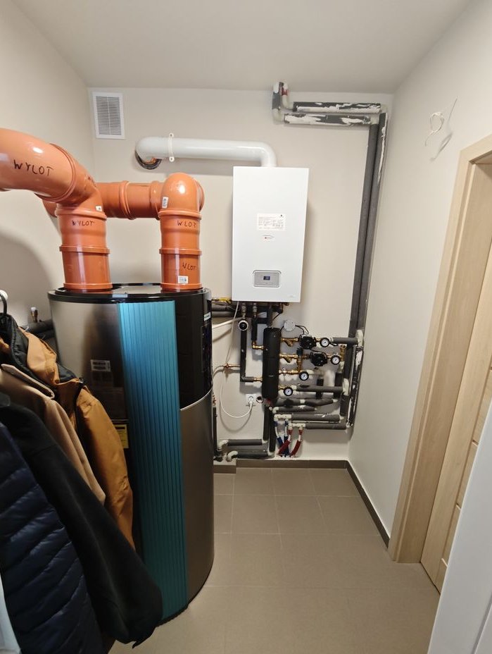 Pompa ciepła wyposażona dodatkowo w grzałkę elektryczną do ciepłej wody użytkowej wraz z buforem 200 l, możliwość grzania wody piecem gazowym. Pompa może być również wykorzystana do chłodzenia domu.