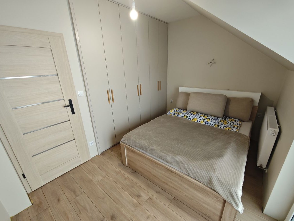 W sypialni znajduje się duża szafa w zabudowie.