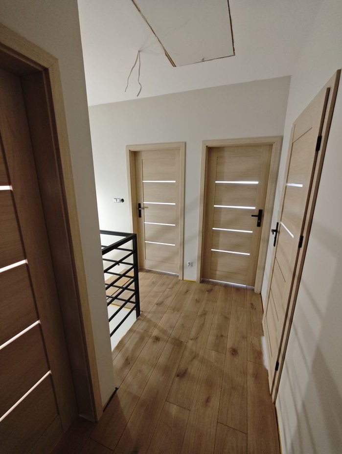 Na parterze panele winylowe, na piętrze laminowane. Schody dębowe.