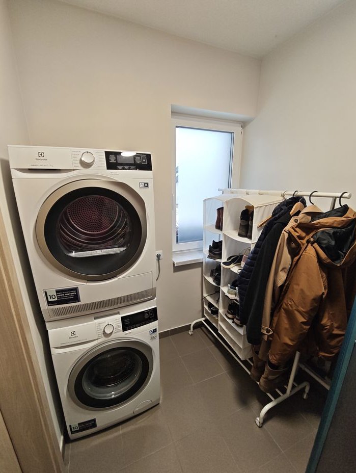 Dom wyposażony w meble oraz duże AGD (piekarnik, płyta indukcyjna, zmywarka, pralka, suszarka, lodówka).