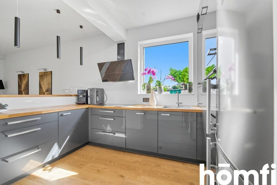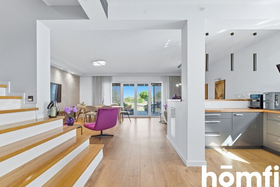 Built in 2016, this 162 m² house was designed with a family in mind who value space and functionality. From the moment you enter, you can feel this place has a soul – the living room with kitchenette invites you to spend time together. Extensive glazing opens the space to the garden and terrace, allowing the interior to be filled with greenery from the outside.