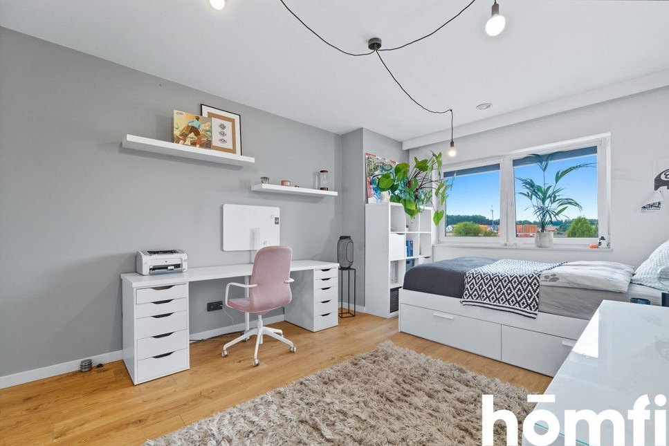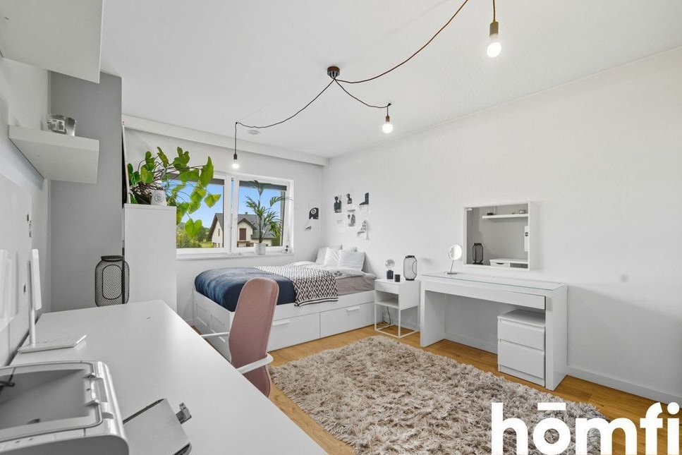 Na piętrze znajdują się cztery komfortowe sypialnie, które dzięki swojej ustawności można aranżować według własnych potrzeb – czy to jako prywatne pokoje dziecięce, elegancki gabinet, czy przestronną sypialnię główną z wyjściem na balkon. Dwie łazienki zapewniają wygodę wszystkim domownikom, a dodatkowe pomieszczenie gospodarcze, przekształcone w pralnię, czyni codzienność jeszcze bardziej praktyczną.