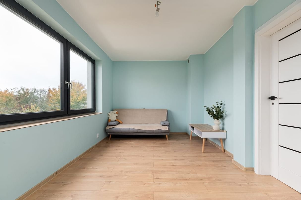 Wnętrze: Przestronny, bardzo widny salon z dużymi oknami – idealne miejsce do wypoczynku.