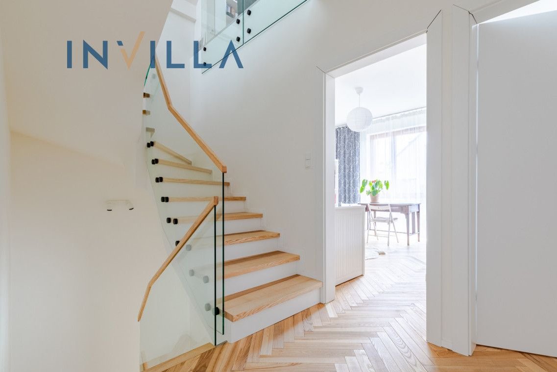 Dom wykończony został w stylu nowoczesnym z użyciem materiałów premium - na podłogach znajduje się naturalny drewniany parkiet, a stylowe, drewniane schody dodają wnętrzu elegancji i klasy.