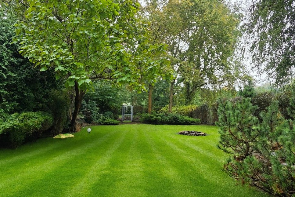 Działka o powierzchni 1580 m² została pięknie zagospodarowana – trawniki, nasadzenia, drzewa, kwitnące krzewy i altana tworzą idealne warunki do relaksu.