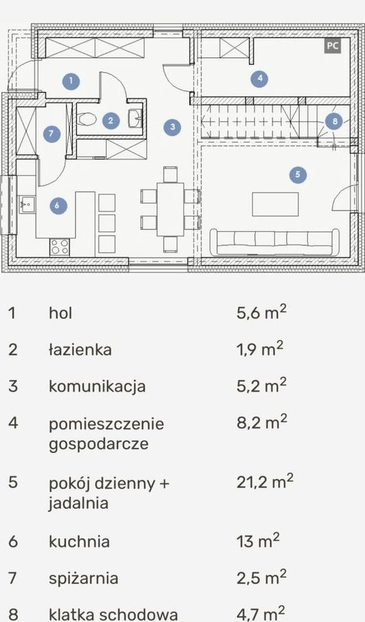 - klatka schodowa ( możliwość zamknięcia i zrobienia dodatkowego pokoju)