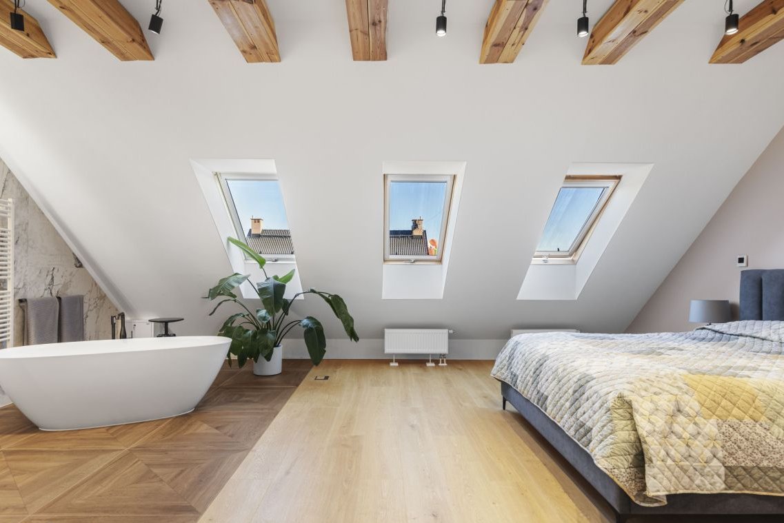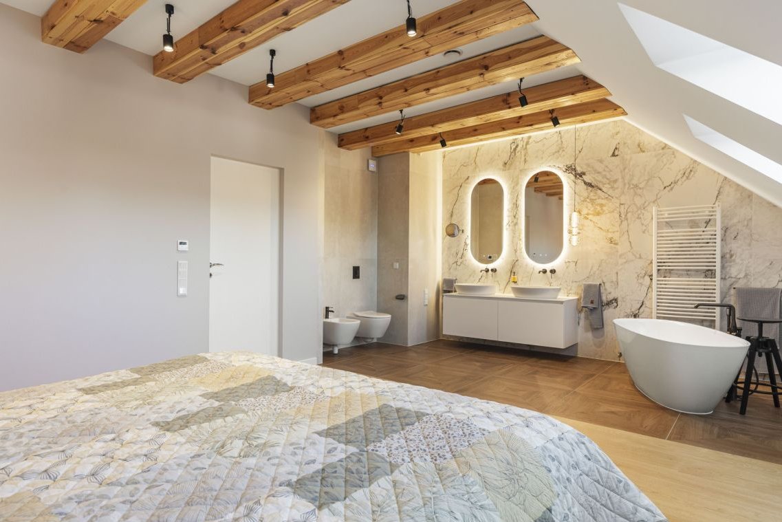 - sypialnia główna z prywatną łazienką i pasem ogrzewania podłogowego po obu stronach łóżka oraz meblami na wymiar. Luksusowa armatura Grohe Essence (Brushed Hard Graphite), wanna z wzmocnionym podłożem, miski Villeroy & Boch. Unikalne lustro Ruke z funkcją podgrzewania, technologią Nano Protection i oświetleniem True Light.